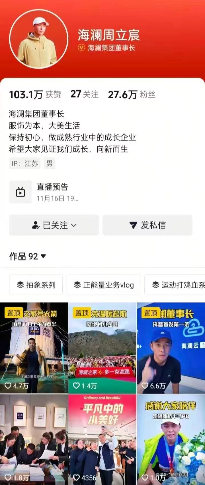 如今,周立宸积极拥抱新渠道,现身直播带货,并且自己注册抖音号“海澜周立宸”,分享个人生活和品牌故事,粉丝数狂飙数十万,不仅拉近了品牌与年轻用户的距离,也为海澜之家注入了鲜活的时代感。