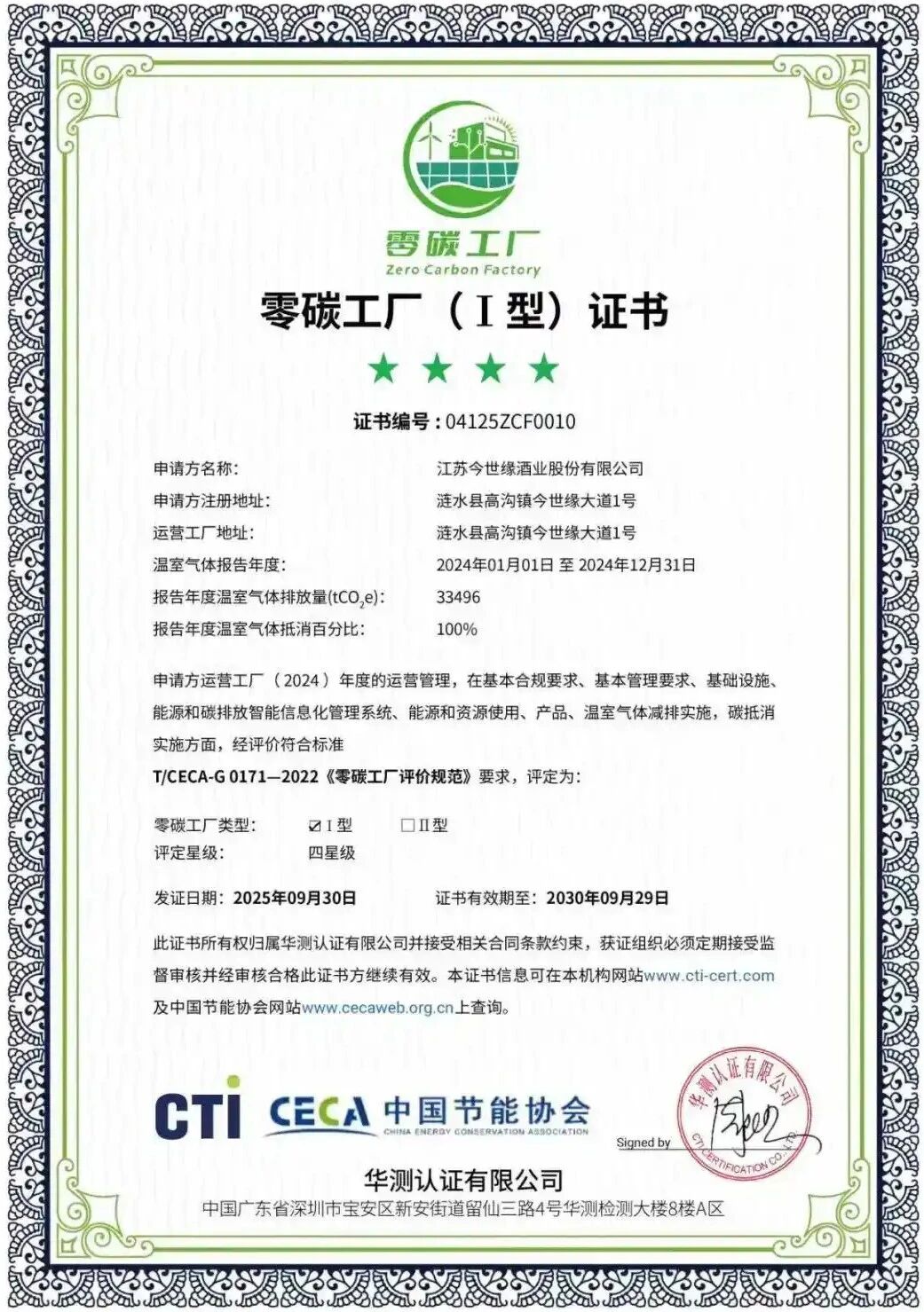 2025年11月,今世缘酒业成功入选江苏省工信厅公布的2025年度江苏省零碳(近零碳)工厂名单,这不仅意味着今世缘成为江苏省唯一获此殊荣的白酒企业,更是行业内首家通过“绿色食品+零碳工厂”双认证的企业。