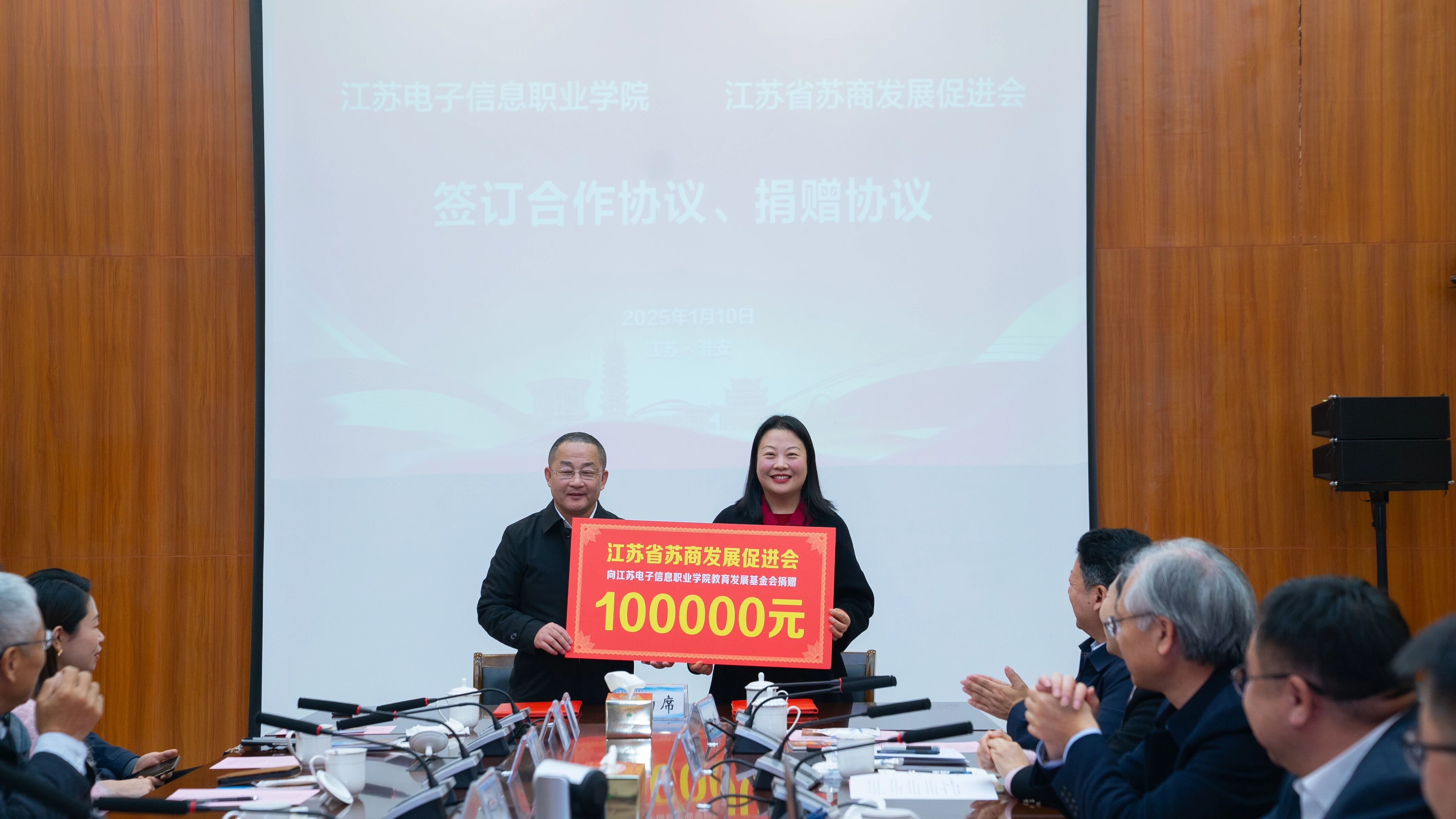 值得一提的是,1月10日,在江苏省先进制造业集群联盟2024年度工作会议期间,苏商会与江苏电子信息职业学院签署共建苏商产业智库协议、合作协议、捐赠协议。苏商会淮扬服务中心负责人徐志民代表苏商会向江苏电子信息职业学院教育发展基金会捐赠人民币10万元整,用以支持学院教育发展,现场举行了捐赠仪式。